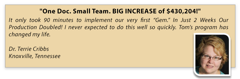 settingsYES, Tom! Please rush me a copy of your book, “Transform Your Practice From Coalmine to Goldmine - Before It’s Too Late.” I can’t wait to discover how to build my practice, quickly achieve financial independence, and help more patients achieve better health.